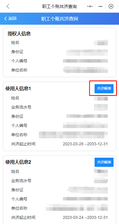 第四步:辦理完成后,可通過“家庭共濟(jì)”——“共濟(jì)關(guān)系查詢解綁”查詢綁定情況,“解除綁定”功能也可在此界面操作。
