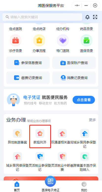 第一步:下載“湘醫(yī)?!盇pp,或進(jìn)入“湘醫(yī)保”App小程序,登錄后在首頁“業(yè)務(wù)辦理”中找到“家庭共濟(jì)”,點(diǎn)擊“共濟(jì)申請”。