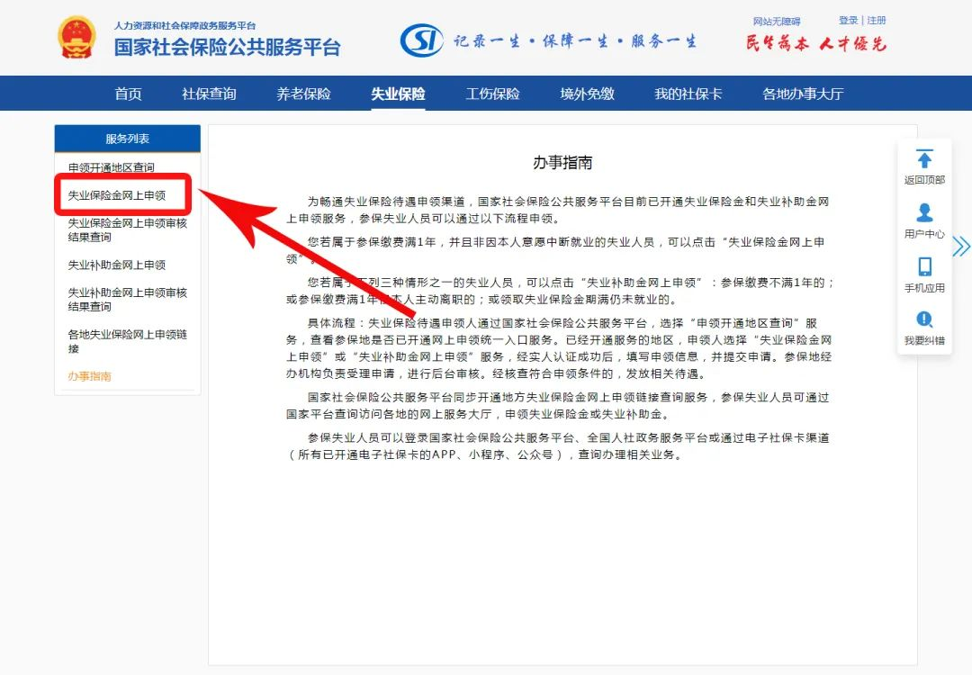 3、登錄“國(guó)家社會(huì)保險(xiǎn)公共服務(wù)平臺(tái)”(http://si.12333.gov.cn),點(diǎn)擊【失業(yè)保險(xiǎn)】→【失業(yè)保險(xiǎn)待遇申領(lǐng)】→【失業(yè)保險(xiǎn)金網(wǎng)上申領(lǐng)】辦理。
